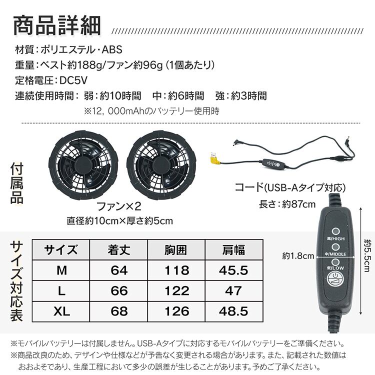 【重量(約)】:ベスト・188g/ファン・96g(1個あたり)