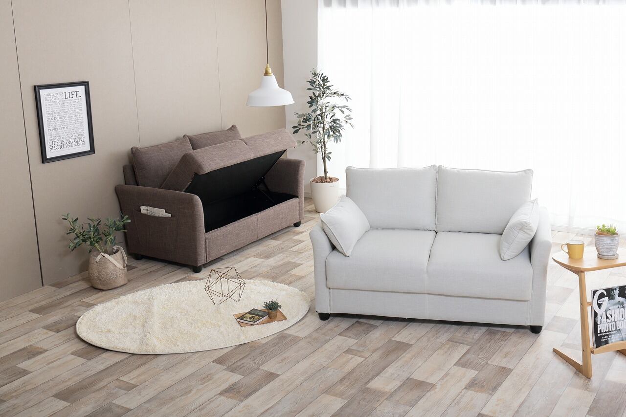 ソファの下には、雑誌やリモコン、おもちゃなどをすっきりと収納できるスペースがあります。生活空間が整理整頓されることで、心地よいリビングを実現します。収納の便利さをぜひ体感してください!