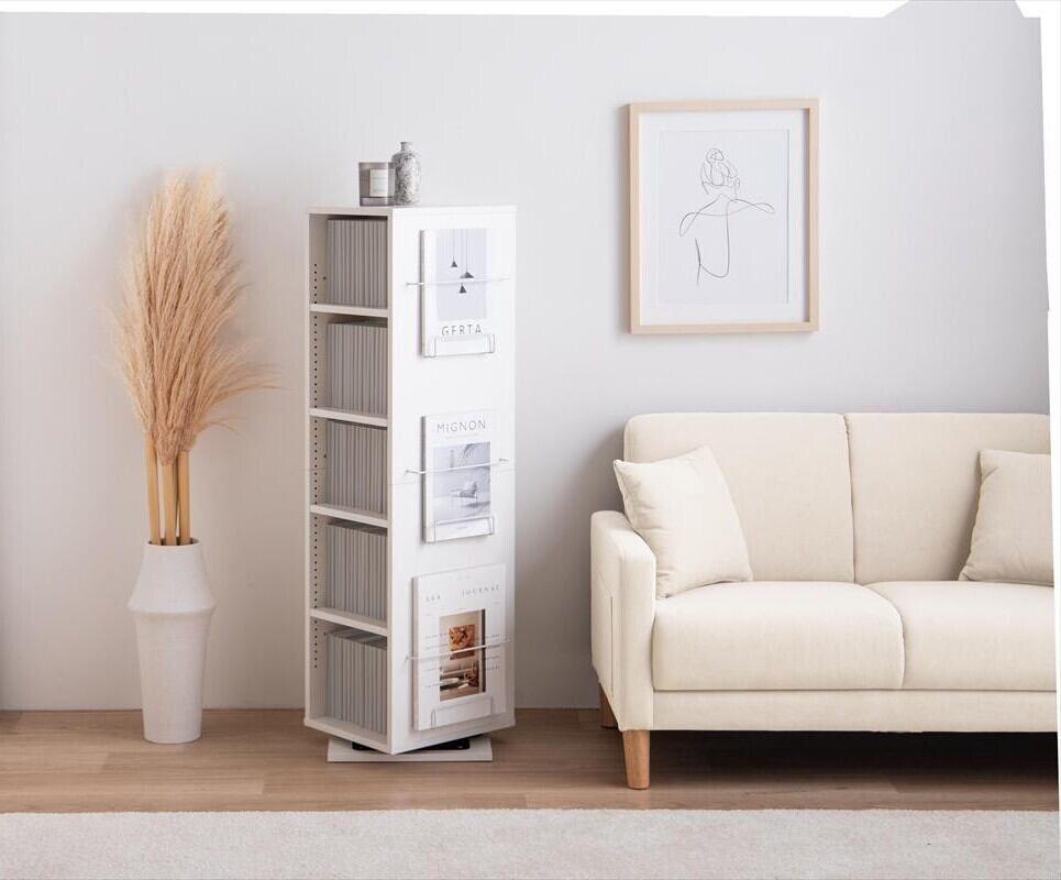Libroの回転ブックシェルフは、5段の豊富な収納スペースを持ちながらも、幅わずか36cmのコンパクト設計です。回転式のデザインにより、奥のアイテムも簡単に取り出せ、リビングや書斎、子供部屋など、さまざまなシーンで活躍します!このブックシェルフを使えば、お部屋のコーナーを有効活用できる理想的なスタイルが手に入ります。