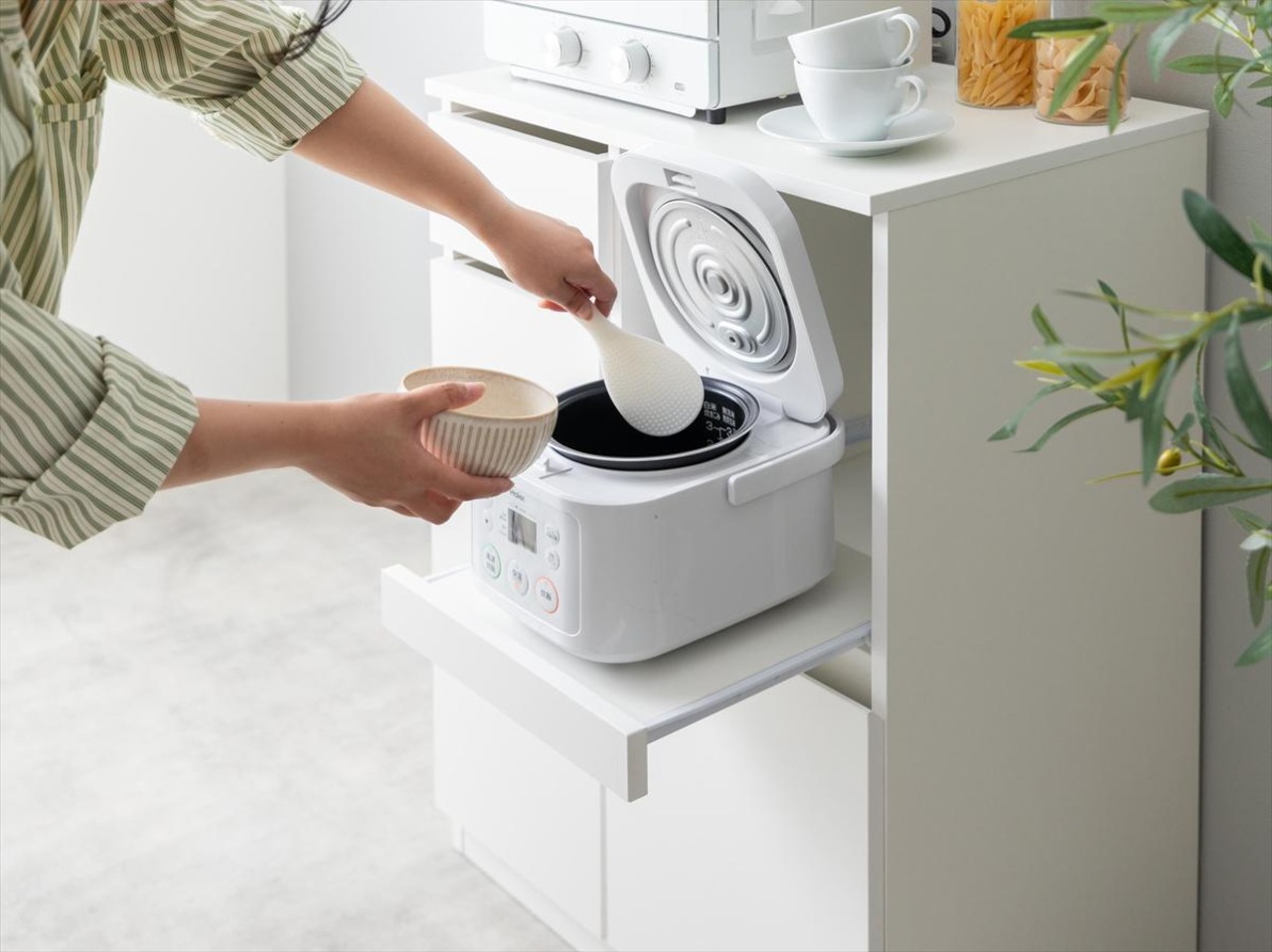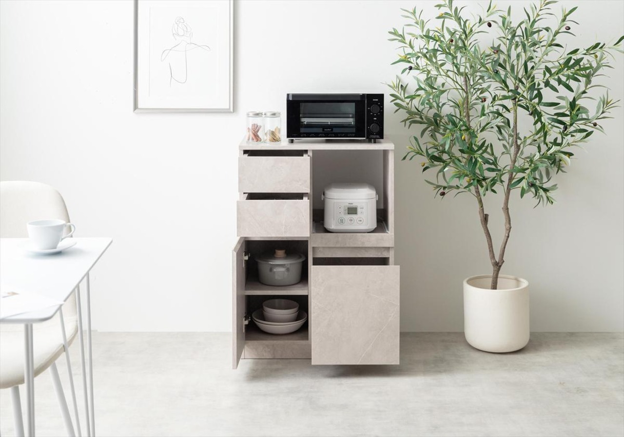 充実した収納力で、キッチン家電や食器・小物などをまとめて収納できる『Cyrus(サイラス)』レンジ台