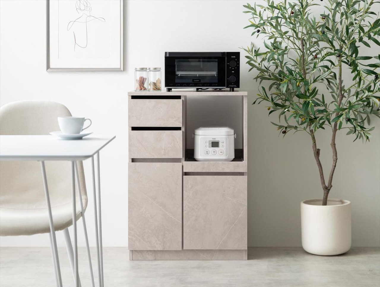 Cyrusレンジ台は、幅60cmのコンパクトなサイズにもかかわらず、使い勝手の良い収納スペースを提供します。上段には電子レンジやトースターを設置し、下段には食器や調理器具をたっぷり収納可能。キッチンやダイニングでの使用はもちろん、様々なシーンで活用できる設計です!このレンジ台があれば、毎日の料理がより楽しくなること間違いなしです。