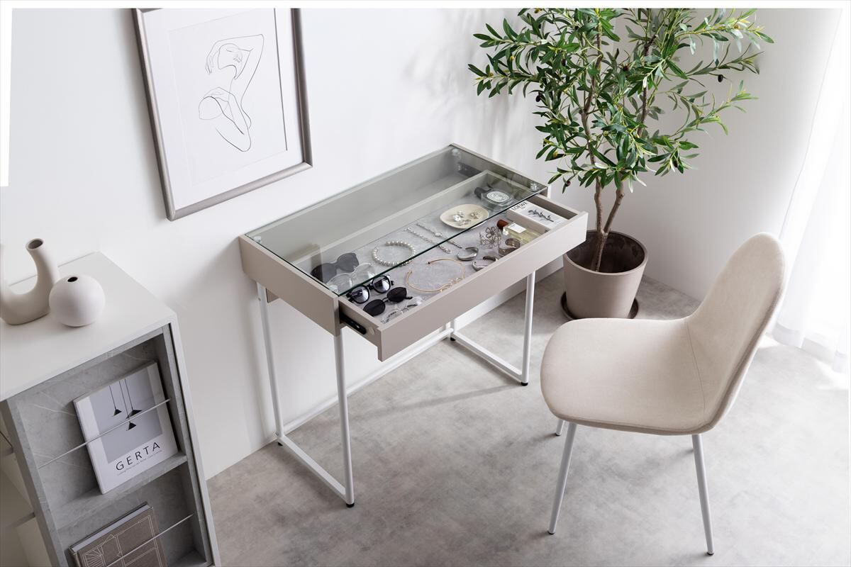お気に入りのコスメやアクセサリーがディスプレイできる、ショーケースのような美しいガラスデスク