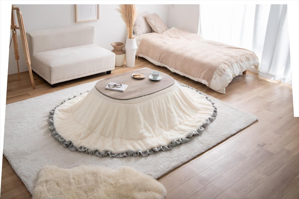 お部屋に馴染むカラーのこたつテーブルと大人可愛いフリル付きの布団を組み合わせたこたつ2点セット