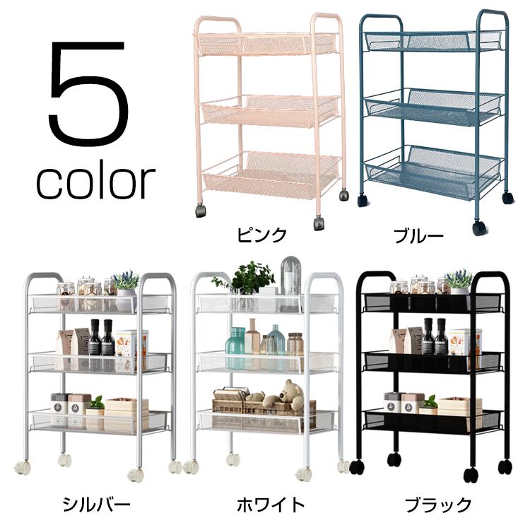 キッチンワゴン キャスター付き 3段 カート メッシュ バスケット スチール ラック メタル