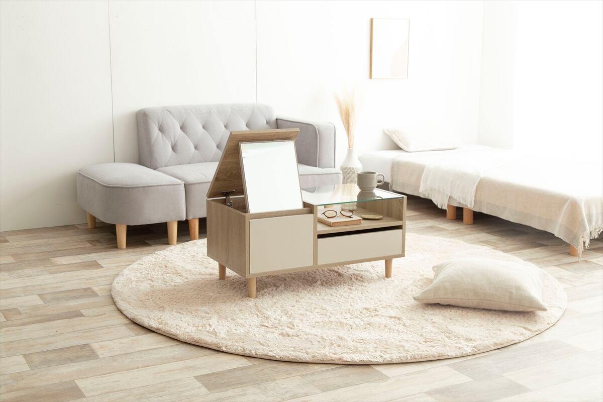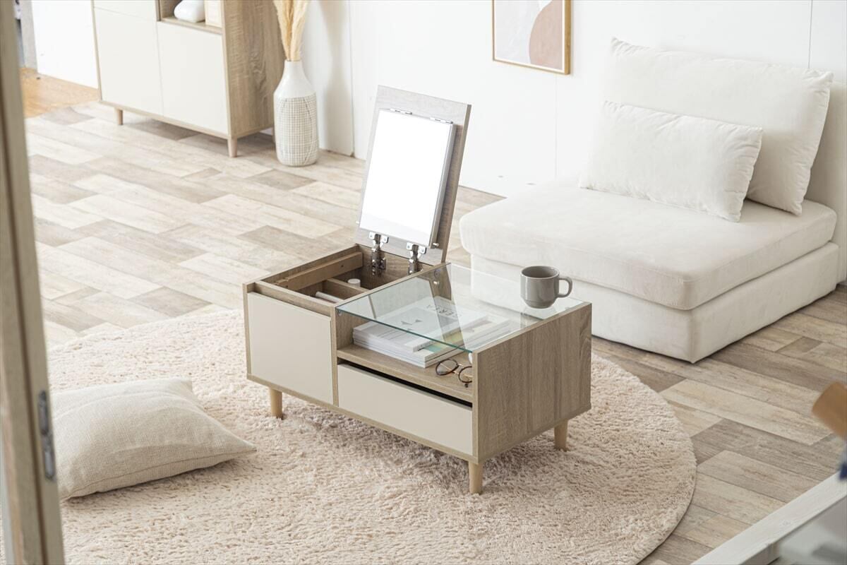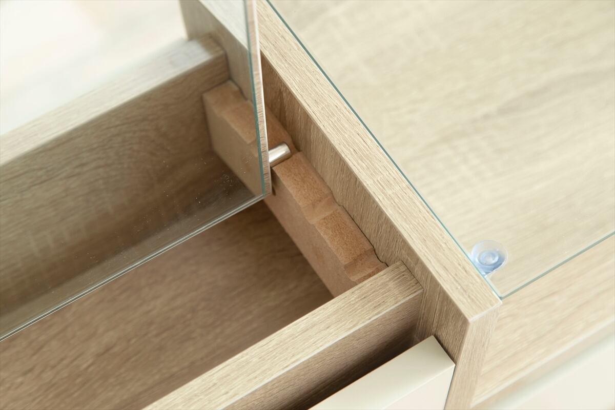 デザインにもこだわり、シンプルでスタイリッシュな外観に仕上げました。どんな部屋にも調和するエレガントな木製フレームと、上質なガラストップが特徴です。コンパクトなサイズながらも、たっぷりの収納スペースを確保しています。
