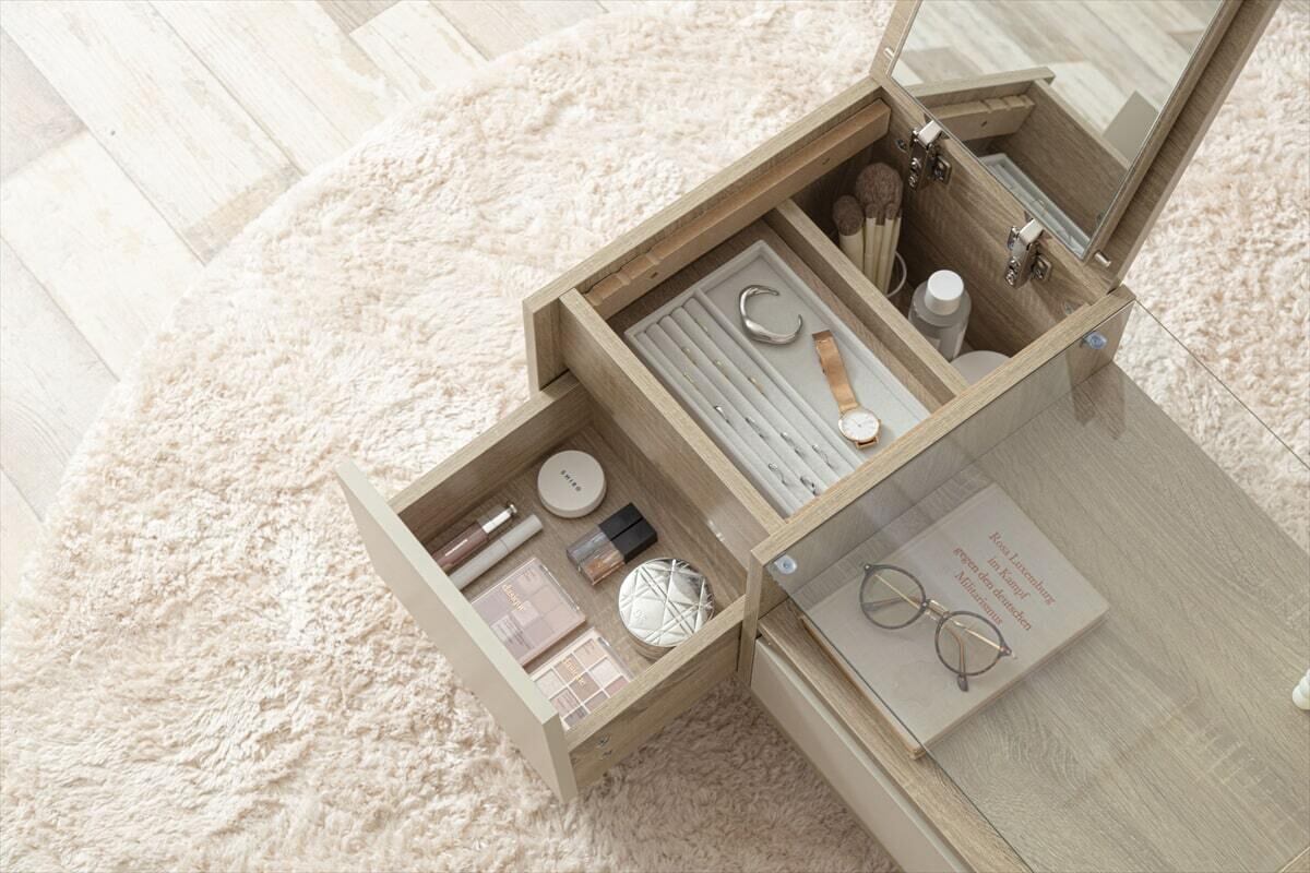 Erin ディスプレイ収納付きドレッサーテーブルは、美しいデザインと実用性が融合した一台です。天板にはメイク道具やアクセサリーを収納できる引き出しと、ディスプレイスペースがあります。化粧品やジュエリーを美しく展示することができ、いつでもお気に入りのアイテムを手に取ることができます。