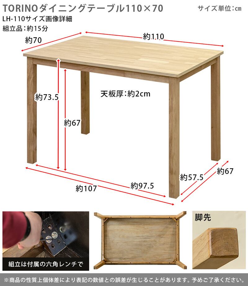 このテーブルは、110×70cmというコンパクトなサイズながら、十分なスペースを確保しています。ダイニングルームやキッチン、リビングルームなど、様々な空間にフィットします。