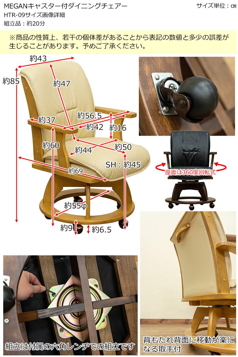 キャスター付きダイニングチェアは、移動が簡単な特長があります。座面には厚みのあるクッションを使用し、一日中快適に座ることができます。また、高さ調節機能も搭載しているので、様々なテーブルに合わせて使うことができます。キャスターは360度回転し、床を傷つけることもありません。